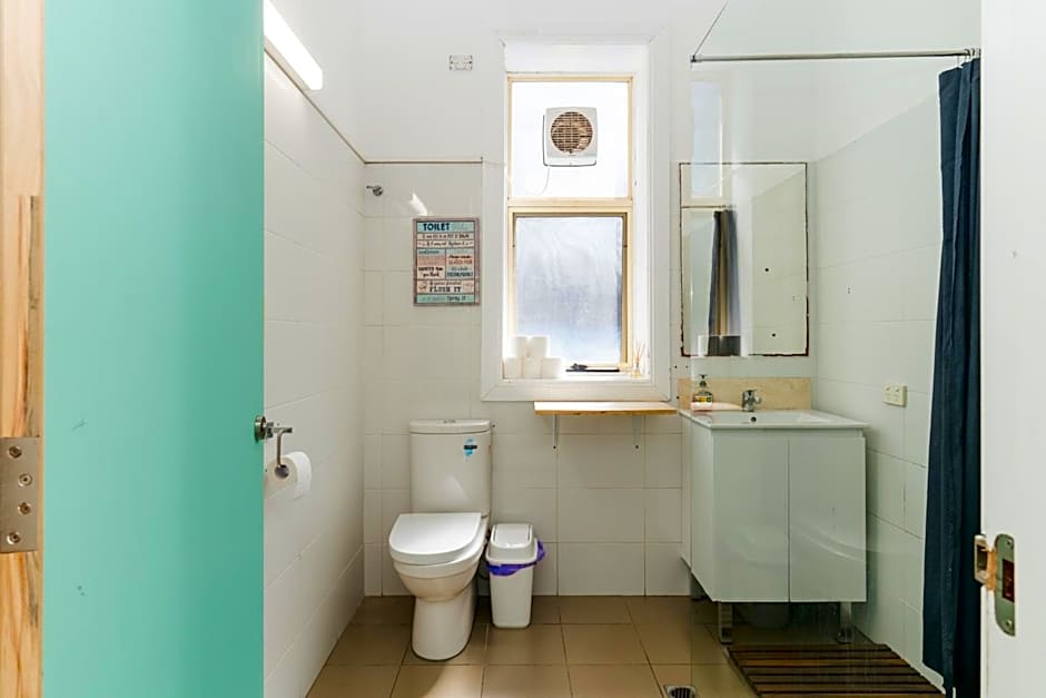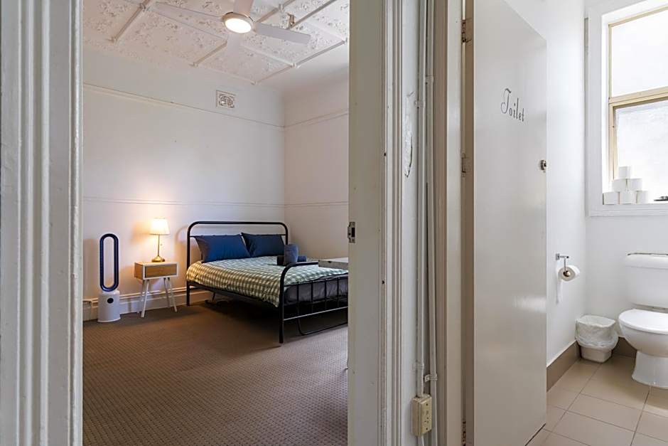This double room features a wardrobe, bedside table, fan and heater. It offers access to shared bathroom facilities.